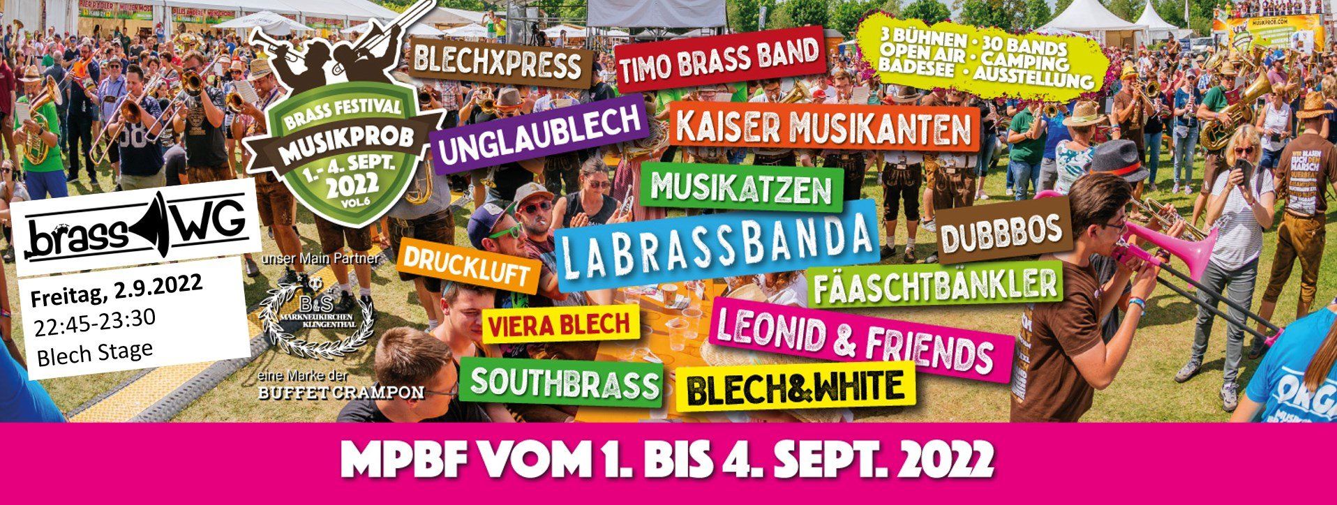 Hier geht's zu unserem persönlichen Teaser Video fürs Musikprob Brassfestival: BrassWG Teaser Musikprob Brassfestival Pfullendorf - 02.09.2022 um 22:45 Als Vorband von LaBrassBanda rockt die BrassWG am Freitagabend zur Primetime die "Blech Stage" beim beliebten Musikprob Brassfestival im Seepark Pfullendorf! 02.09.2022 22:45-23:30 Blech Stage OK, da geb 'mer mal richtig Gas 😃 Vor uns am Fr am Start sind außerdem: Druckluft , Southbrass , Die Musikatzen , Blech & White , die Ochsengau Musi und die A96 Musikanten. An den weiteren Tagen erwarten Euch u.a. Faäschtbaenkler , Viera Blech , Desperate Brasswives , Timo Brassband u.v.m. Tickets unter https://musikprob.party/tickets "Das wohl größte Blasmusik und Brass Spektakel findet auch 2022 wieder im Seepark in Pfullendorf statt. Vom 1. bis 4. September werden es wieder über 30 Bands auf 4 Bühnen so richtig brassen lassen. Nur eine Minute entfernt vom wunderschönen Campingplatz mit eigener Brassbühne für euch Musikanten. Wem es zu heiß wird, kann sich im Seeparksee direkt am Festivalgelände abkühlen." #festival #mpbf #pfullendorf #live #feiern #tanzen #brass #brassband #konzert #band #mindelheim